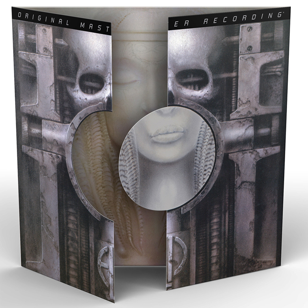 That care extends to the faithful reproduction of the original coveted packaging. Designed by iconic artist H.R. Giger, the cover visually combines an industrial machine with the top half of a human skull along with the now-recognizable ELP logo. A circular screen attached to the right panel opens to reveal another painting that shows a female face, braided hair, and lobotomy scars. On the inside panels, a portrait-style photo of each ELP member is seen within the circular space in Giger’s biomechanical illustration.